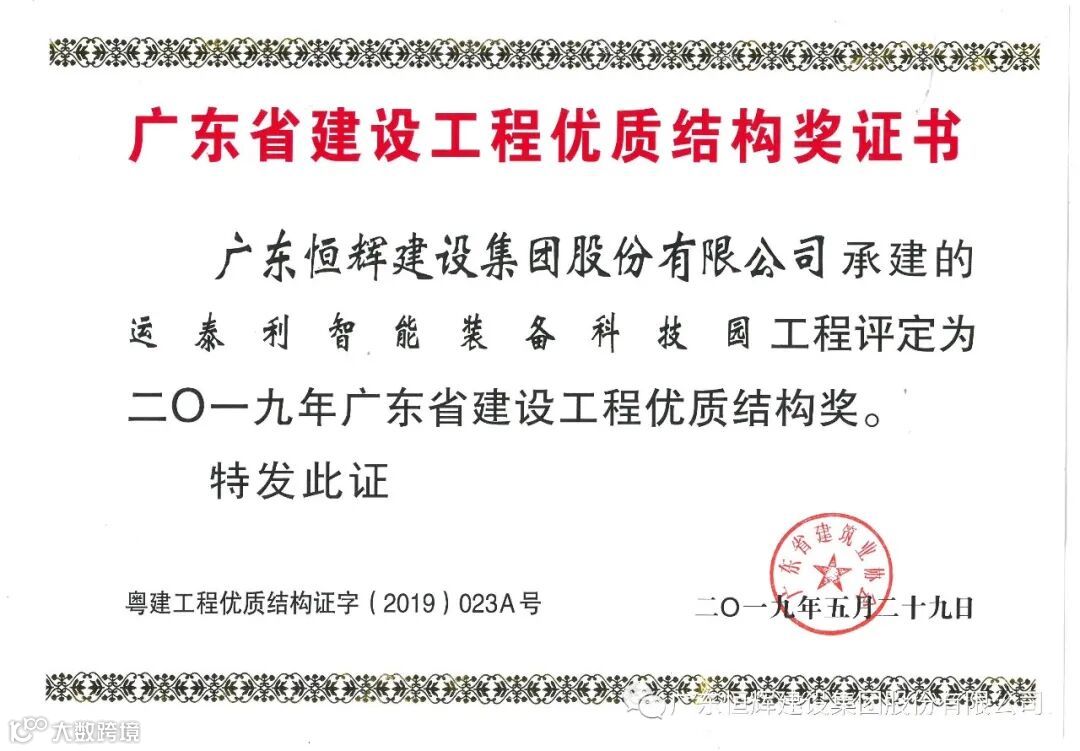 珠海运泰利智能装备科技园项目2019年就已经获得了“广东省建设工程优质结构奖”证书。此次奖项的获得进一步提高了业主和市场对恒辉建设集团的认可,进一步提升了我司在广东省乃至全国的品牌影响力。