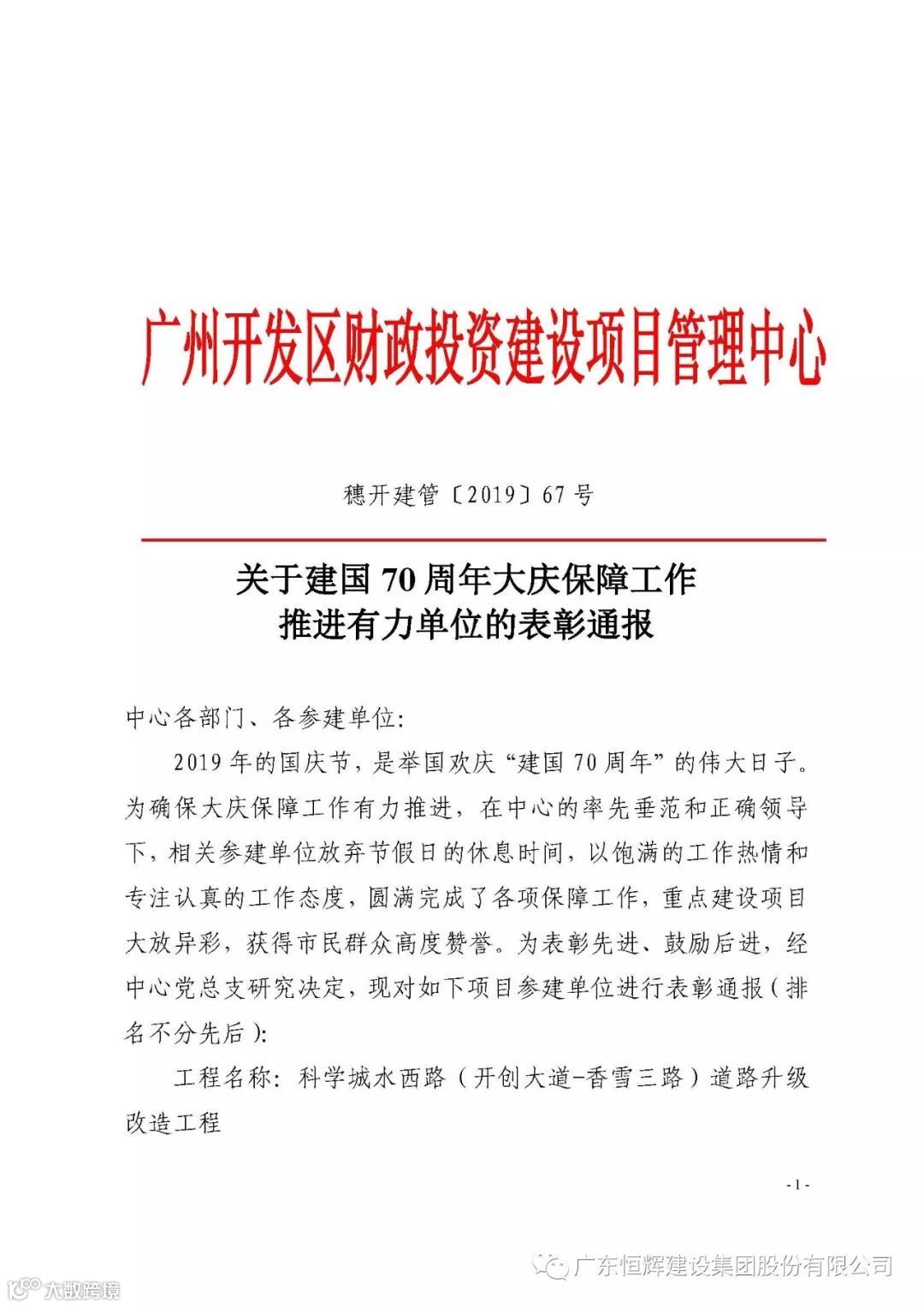 2019年10月11日,广州市黄埔区建设项目管理中心下发《关于建国70周年大庆保障工作推进有力单位的表彰通报》,对在国庆期间大庆保障工作中作出突出表现的单位予以通报表扬。恒辉建设集团获此荣誉。