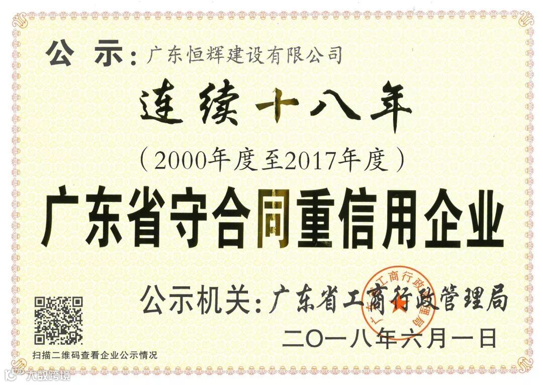 近日,经广东省工商行政管理局审核批准,广东恒辉建设有限公司(以下简称“公司”)获得“广东省守合同重信用企业”荣誉称号。这是公司连续十八年(2000-2017)获得该荣誉。