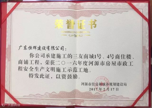三友·南城(1#、4#)商住小区工程自施工以来,项目部本着“以工程质量求生存,以科学管理求效益”的理念,高起点高标准严要求,努力做到“开工必优,一次成优”,合理组织施工生产,做好安全质量标准化管理,做好日常管控检查,优质高效地完成了各个节点任务。项目工期、质量、安全及文明施工得到市各级主管部门、建设单位及监理的一致好评,并荣获“2016年河源市房屋市政工程安全生产文明施工示范工地”称号。