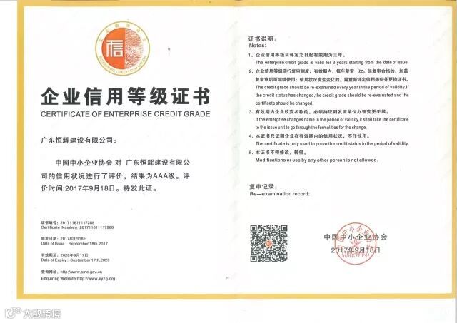 中国中小企业协会是全国中小企业、企业经营者自愿组成的全国性、综合性、非营利性的社会团体,接受国家发改委业务指导和民政部的监督管理,是中国最权威的第三方信用服务机构之一。恒辉建设获得此次殊荣,是社会群体、行业、合作伙伴和官方机构对我司的鼓励。同时,高等级的信用证书是企业展示形象、提高竞争力、扩大市场的有力武器。