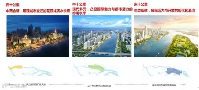 三个十公里:“西十公里”以中西合璧为特点,展现城市变迁的花园式滨水长廊;“中十公里”以现代多元为特点,凸显大都市文化魅力和创新集聚特色的岭南水岸;“东十公里”以生态低碳特点,展现活力与开放的现代化港城。