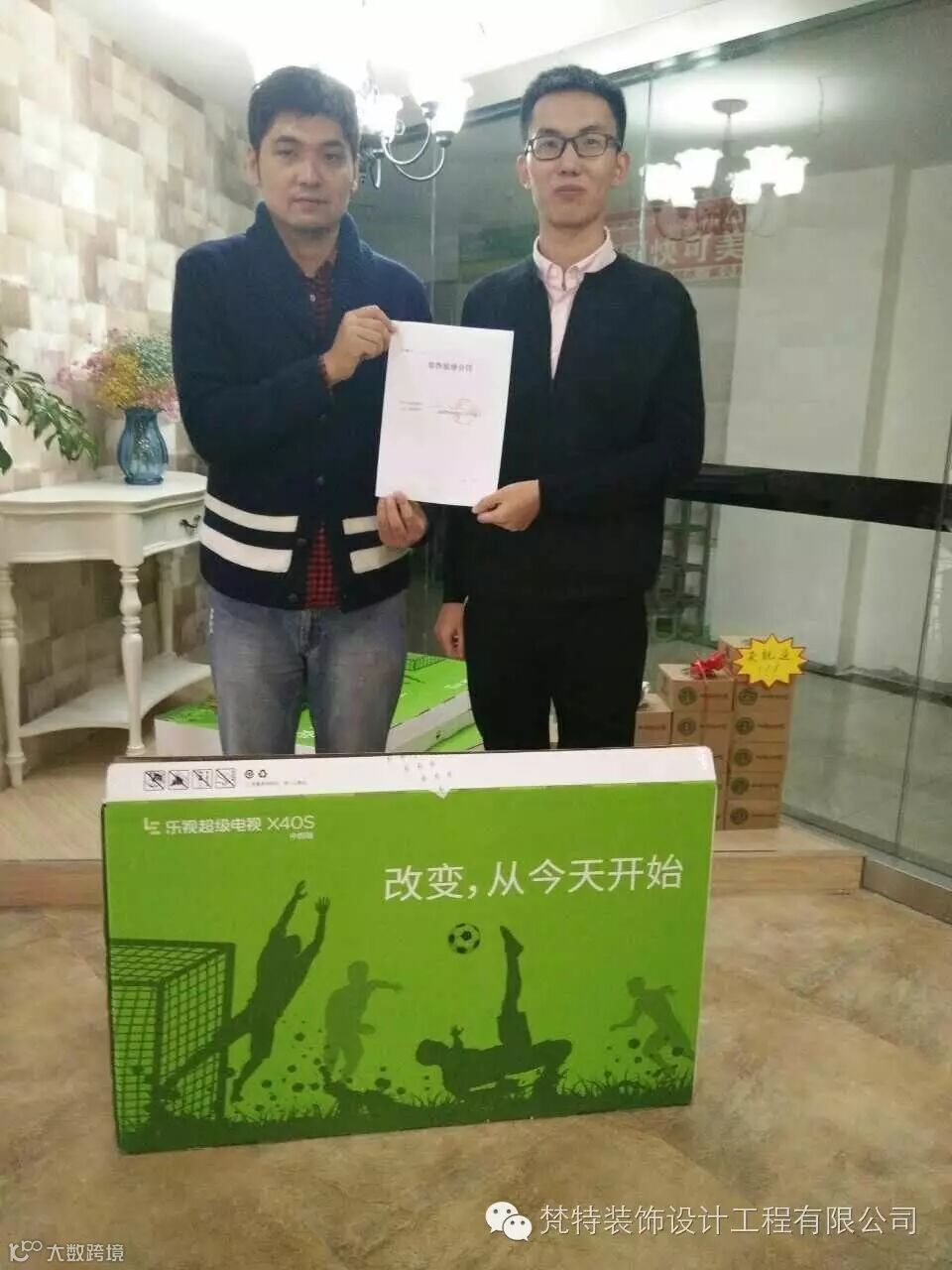 感谢香溢紫郡丁先生对本公司的信任与支持,公司现场赠予丁先生高档乐视电视一台。梵特装饰公司在未来的日子里一定会让您感受最好的设计团队,最好的施工团队的服务。我们坚信每一份的努力都会带来丰硕的果实。