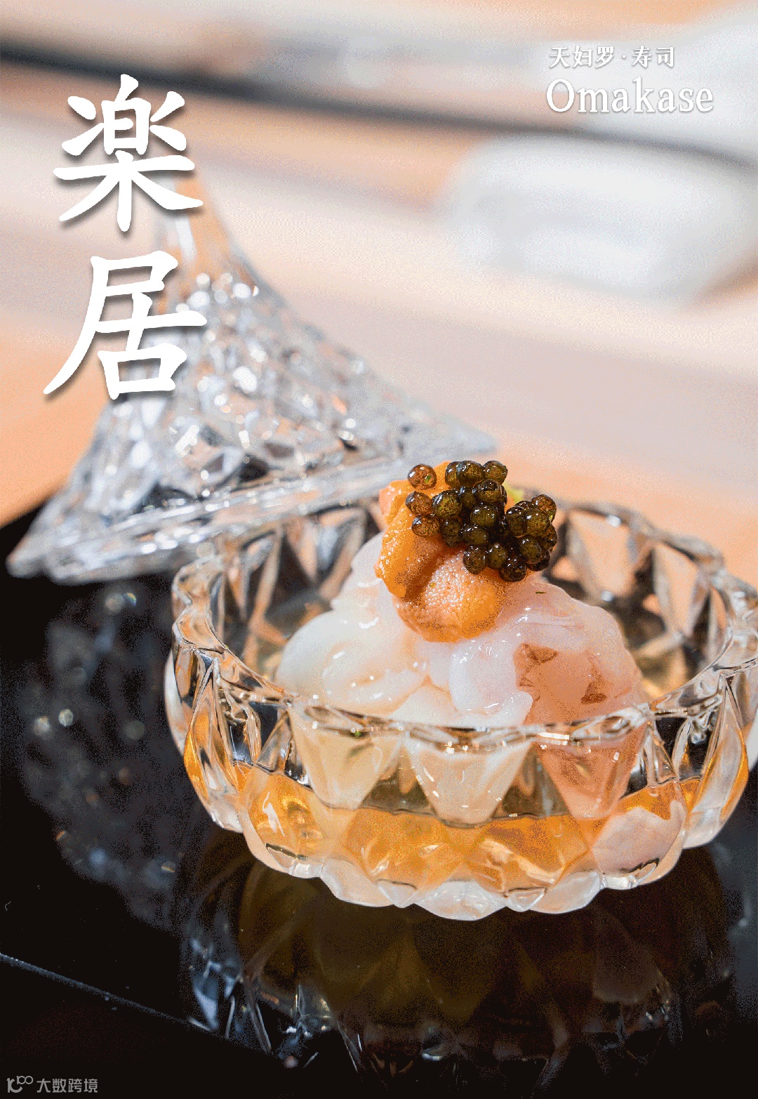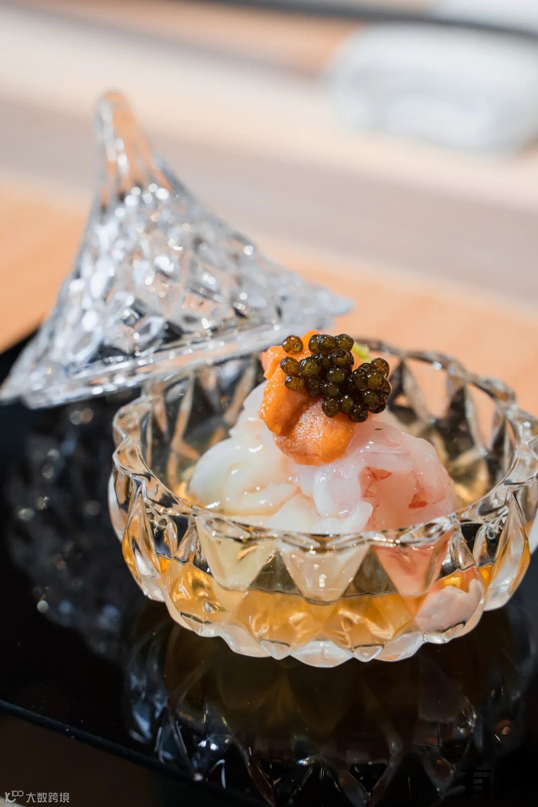 牡蛎肉质鲜美,搭配少许海胆和鱼子酱,口感爽滑且味道清新。