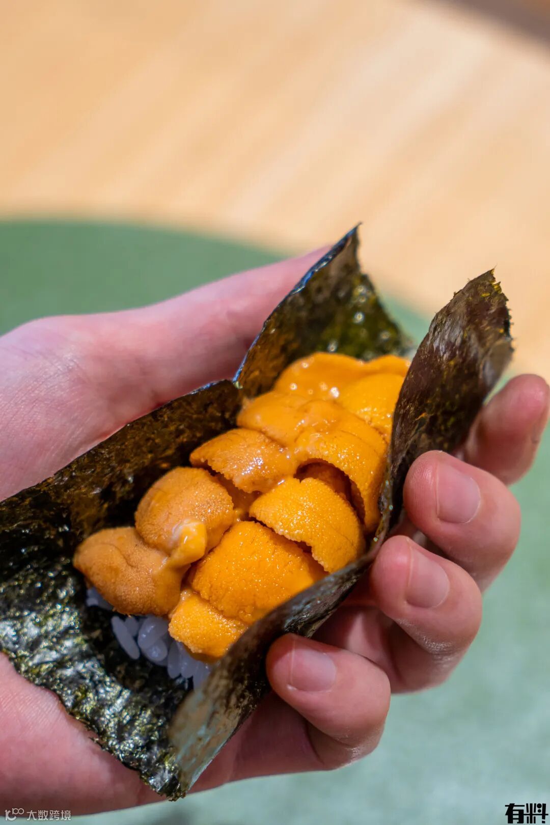 清脆的海苔上铺着些许醋饭,再放上大连和北海道产的马粪海胆,堪称一绝。