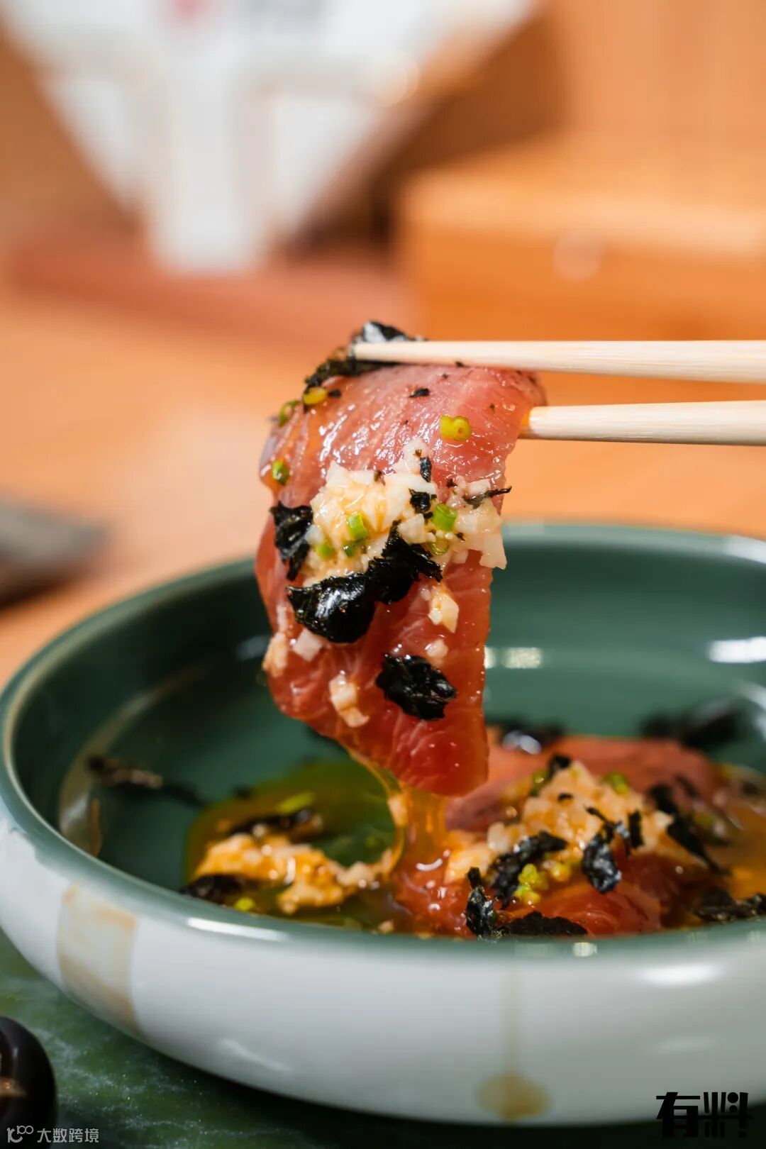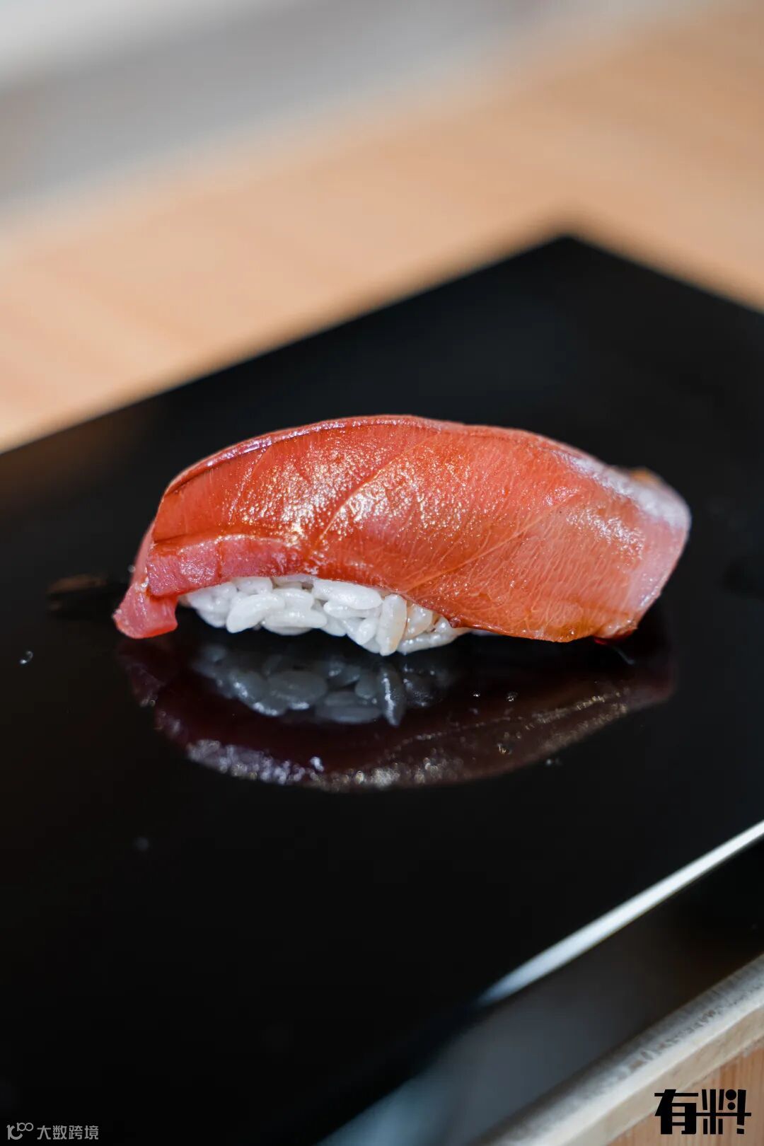 将金枪鱼的中腹送入口中,中腹的油脂会因为口腔的温度而咕嘟咕嘟地融化。