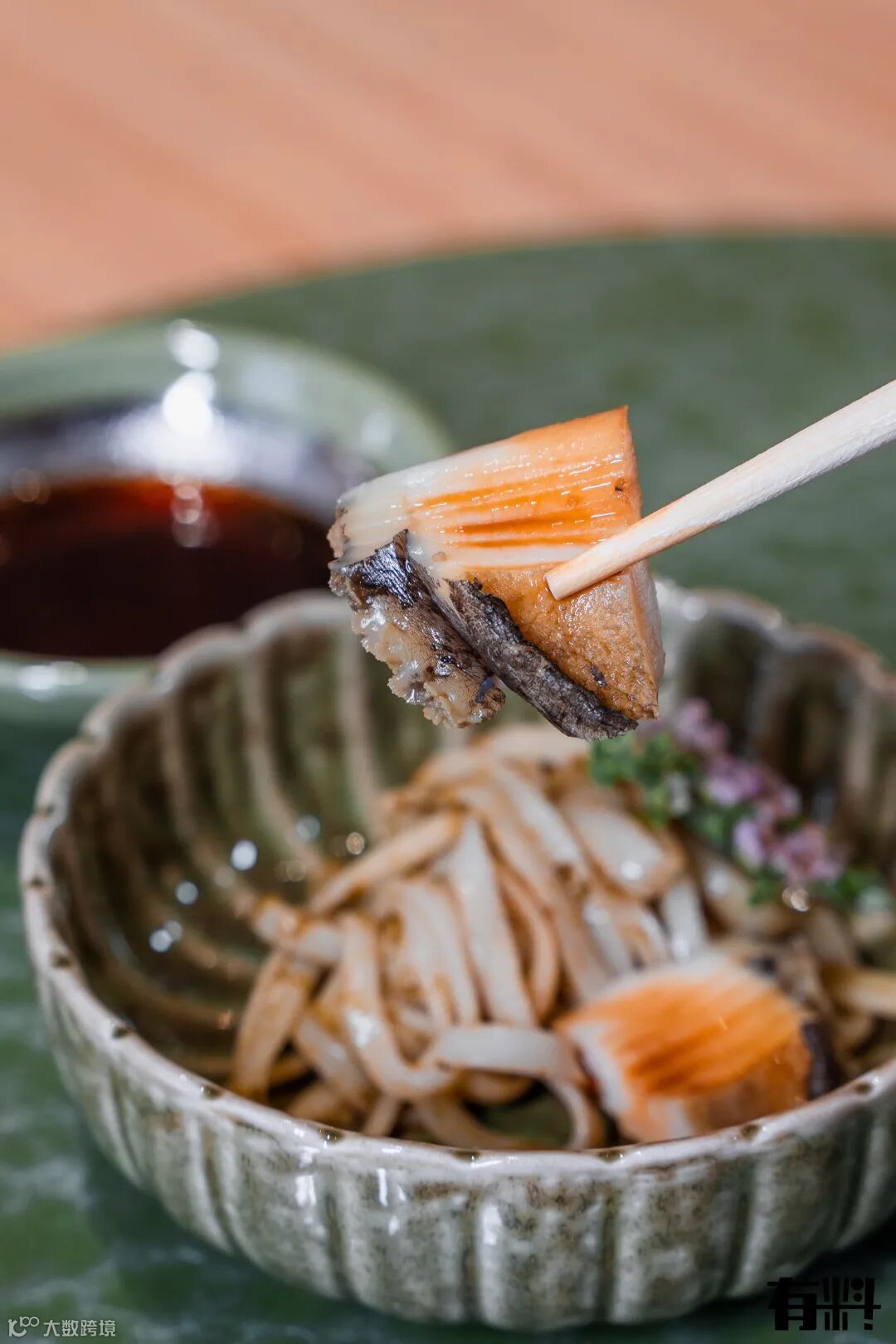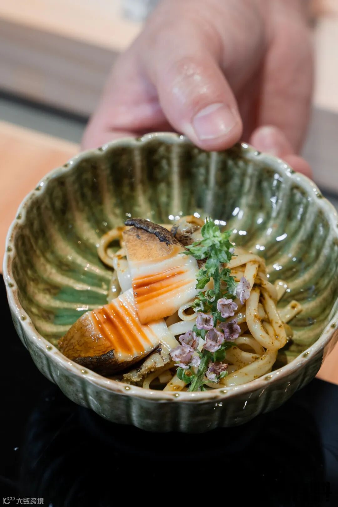 鲍鱼使用低温烹调的方式,不加其他调料保证食材的原汁原味,搭配上手工稻庭乌冬,口感爽滑温润,带着独特的清香。