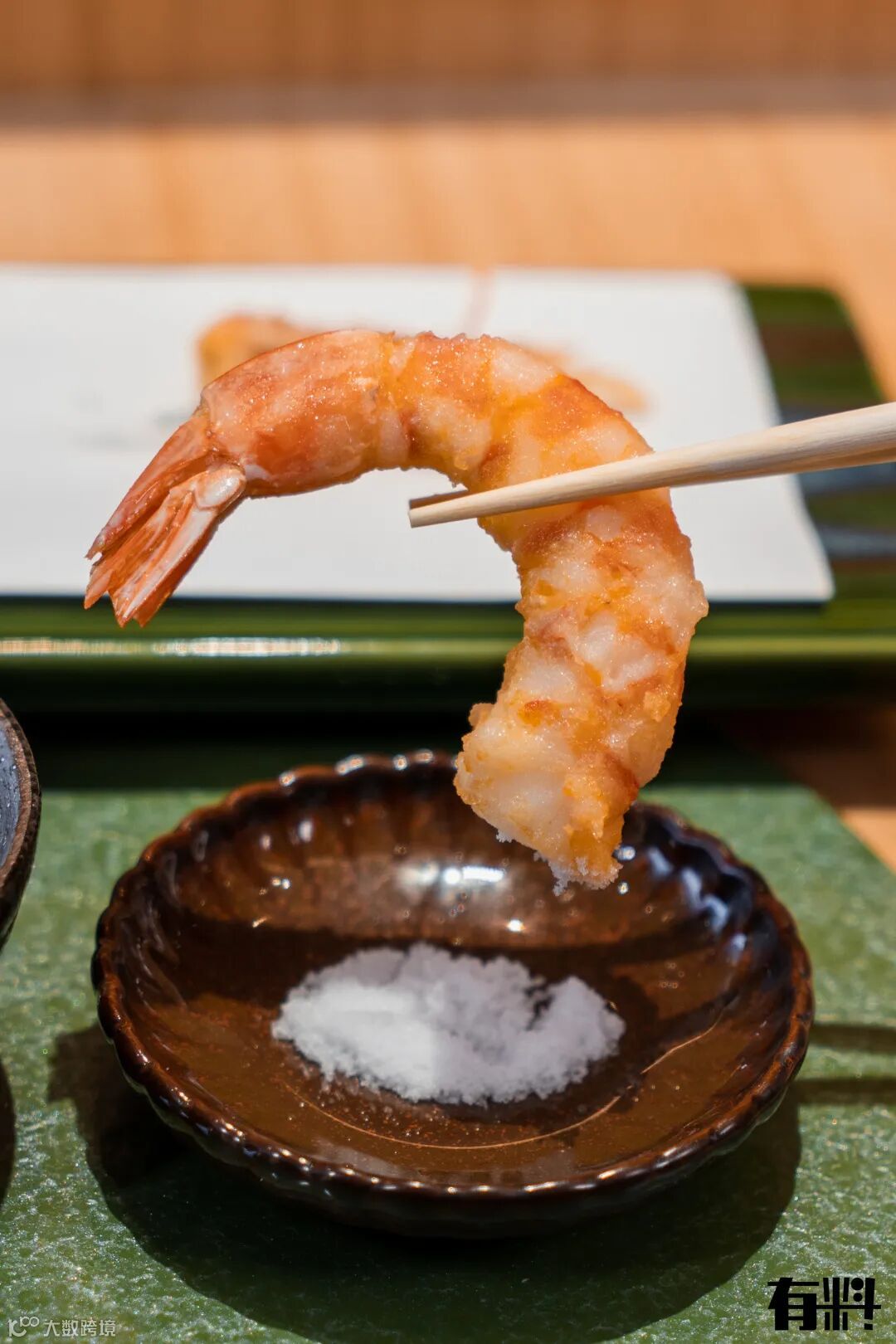 镀上了金黄薄衣的虾身,并没有因油炸而变得干瘪,只是释放出多余水分,将鲜味凝聚在虾身内,只需蘸点海盐佐味。