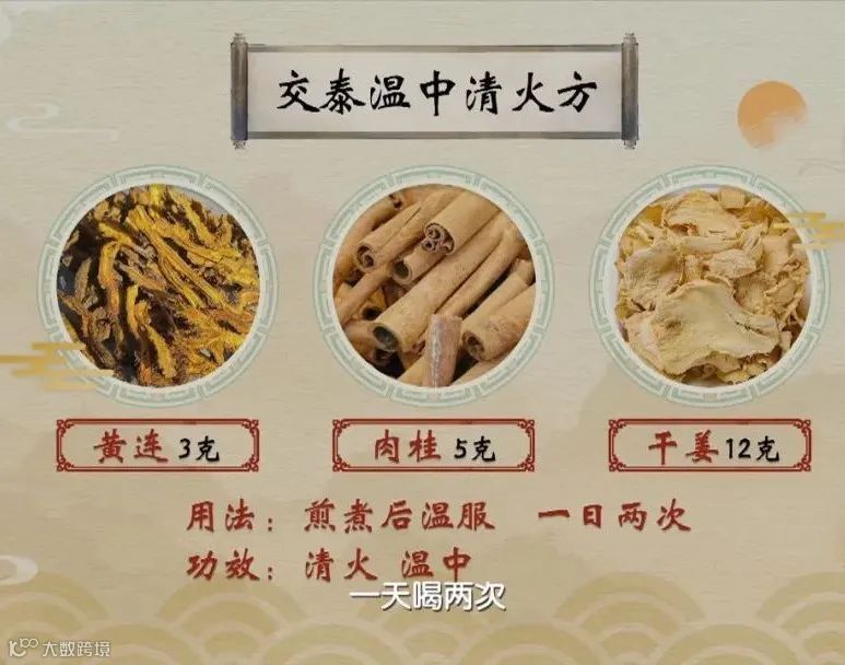 脾胃受寒导致的中焦不畅,可以使用交泰温中清火方,在交泰丸的基础上加入的干姜具有温中、祛寒的功效。