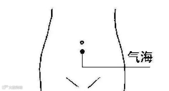 位置:气海穴位于人体的下腹部,直线连结肚脐与耻骨上方,将其分为十等分,从肚脐3/10的位置。
