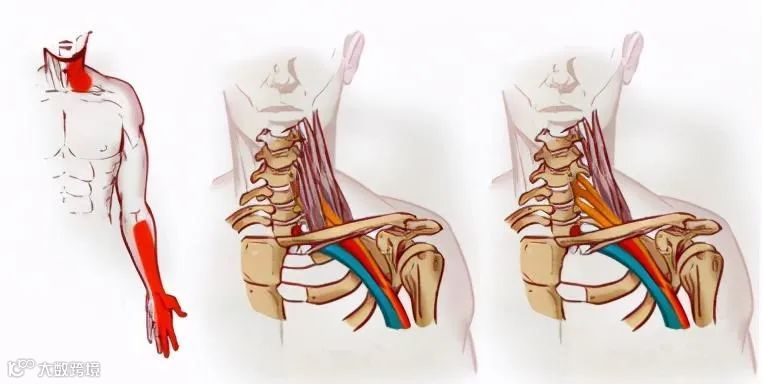 胸廓出口综合征,主要是臂丛神经在胸廓出口处受压迫引起。