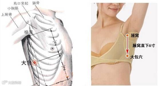 大包:在侧胸部,腋中线上,第6肋间隙处。