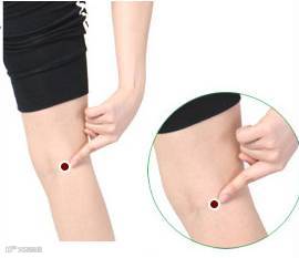 梁丘:该穴位于伸展膝盖用力时,筋肉凸出处的凹洼处;从膝盖骨右端,约三个手指左右的上方也是该穴所在位置。