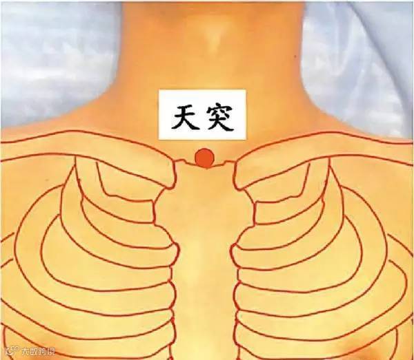 天突:仰靠坐位取穴,位于颈部,当前正中线上胸骨上窝中央。