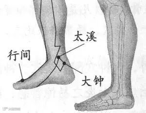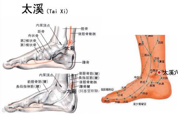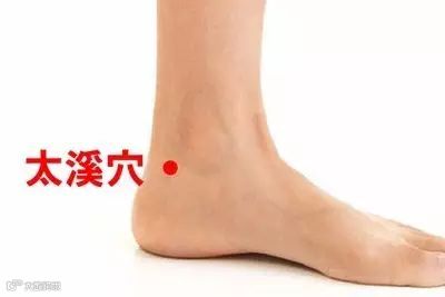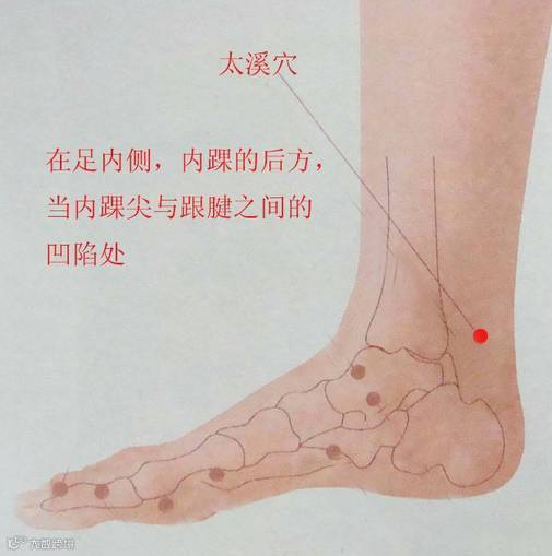 太溪穴:在足踝区,内踝尖与跟腱之间的凹陷处。