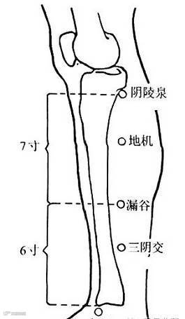 地机:地机穴位于人体的小腿内侧,当内踝尖与阴陵泉穴的连线上,阴陵泉穴下3寸。