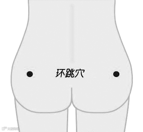 环跳:在臀外下部,当股骨大转子最凸点与骶管裂孔连线的外1/3与中1/3交点处。
