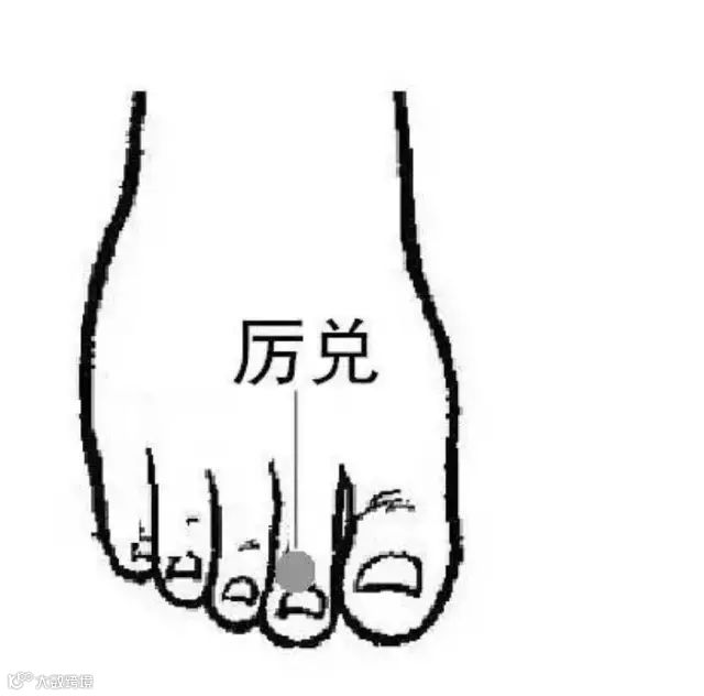 厉兑:人体厉兑穴位于足第2趾末节外侧,距趾甲角0.1寸。