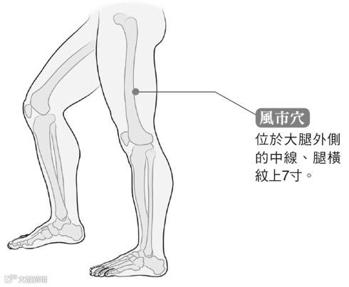 中渎穴:在大腿外侧,当风市下2寸,或在横纹上5寸,股外侧肌与股二头肌之间。