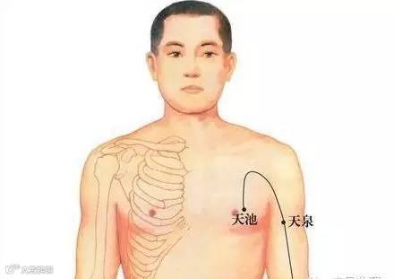 天池穴:在胸部,当第四肋间隙,乳头外1寸,前正中线旁开5寸。