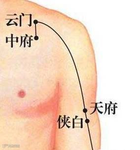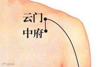 云门:位于胸前壁外上方,肩胛骨喙突上方,锁骨下窝(胸大肌与三角肌之间)凹陷处。