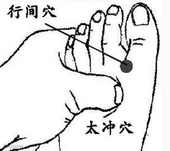 间行穴:可采用正坐或仰卧的姿势,行间穴位于人体的足背侧,大拇趾、二趾合缝后方赤白肉分界处凹陷中,稍微靠大拇趾边缘。