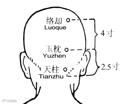天柱穴:该穴位于项部斜方肌起始部,天柱骨(颈椎骨)上端。