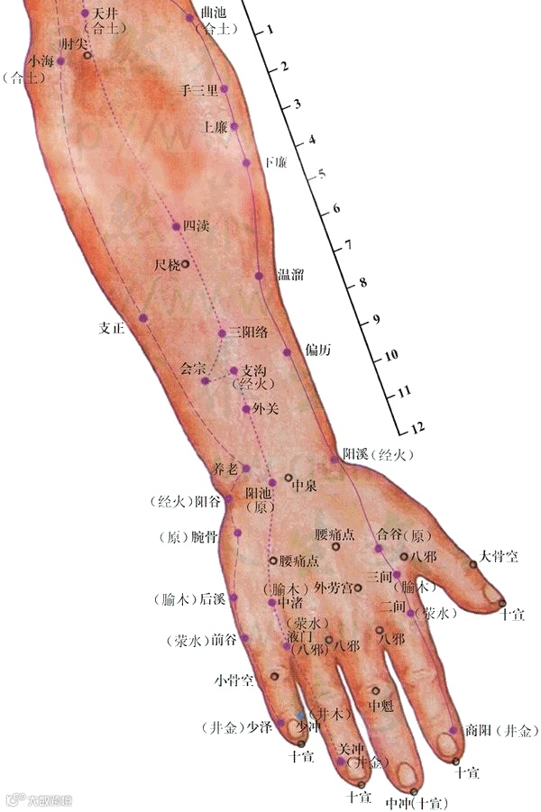 支正穴:取穴为在前臂背面尺侧,当阳谷与小海的连线上,腕背横纹上5寸。