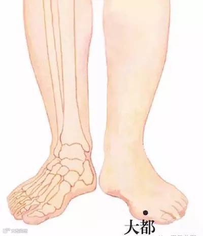 大都:在足内侧缘,当足大趾本节(第1跖趾关节)前下方赤白肉际凹陷处。