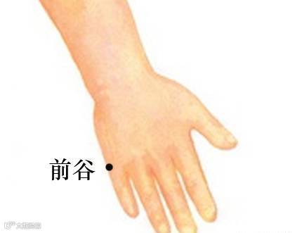 前谷穴:在小指尺侧,握拳第五掌指关节前方,掌指横纹端凹陷处,赤白肉际。