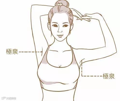 极泉:在腋窝顶点,腋动脉搏动处,举臂开腋取穴。