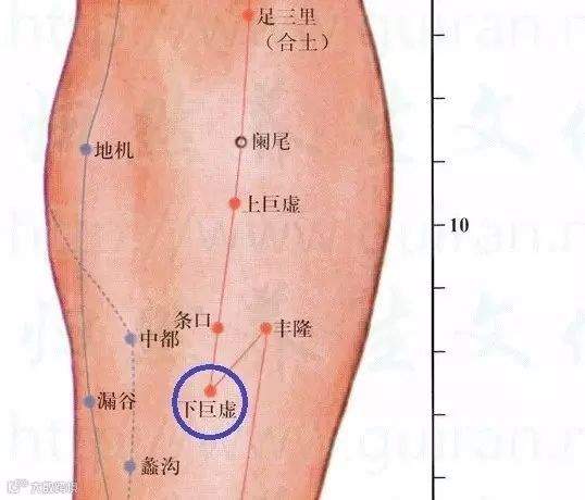 下巨虚:在小腿前外侧,当犊鼻下9寸,距胫骨前缘一横指(中指)。