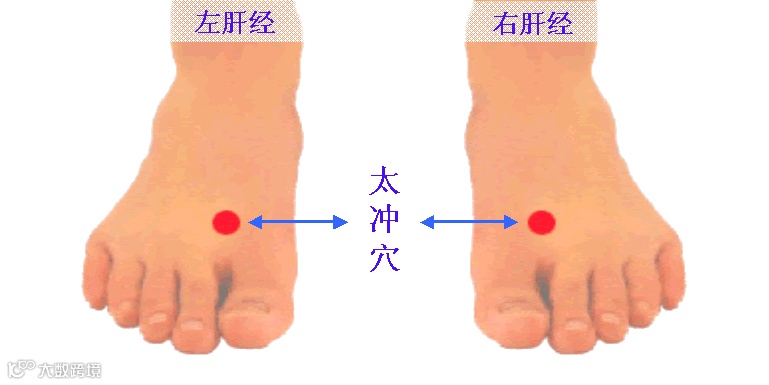 太冲穴:位于位于足背侧,第一、二跖骨结合部之前凹陷处。
