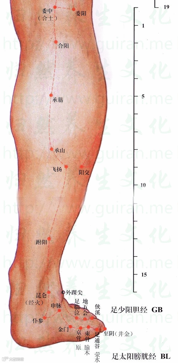 飞扬穴:位于小腿后外侧,外踝尖与跟腱水平连线之中点直上七寸,当腓骨后缘处。