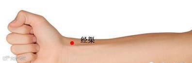 经渠穴:位于桡骨茎突内侧,腕横纹上1寸,桡动脉桡侧凹陷中。