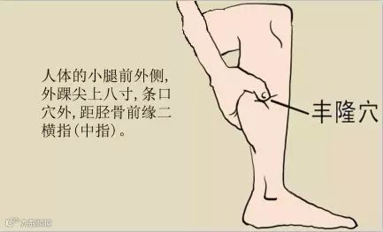 丰隆:从腿的外侧找到膝眼和外踝这两个点,连成一条线,然后取这条线的中点,接下来找到腿上的胫骨,胫骨前缘外侧1.5寸,大约是两指的宽度,和刚才那个中点平齐,这个地方就是丰隆穴,每天按压1到3分钟。