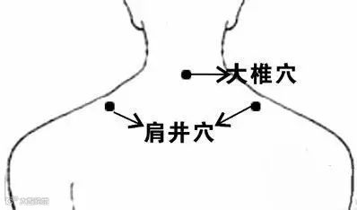 肩井穴:在大椎穴与肩峰连线中点,肩部最高处。