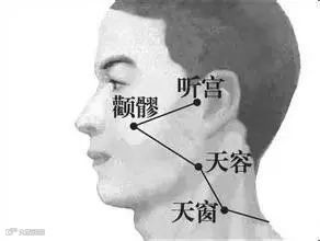 颊车穴:在面颊部,下颌角前上方,耳下大约一横指处,咀嚼时肌肉隆起时出现的凹陷处,左右各一个。