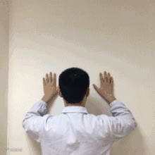 2、直臂外展:面壁直立,双臂下垂,直臂向两侧外展,记录每日抬高的最大角度。上午,下午各一回,每次运动30次以上。