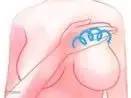 3、用食指和中指贴紧胸部夹起乳头,轻轻挤压手指稍稍并紧,成圆弧形旋转。