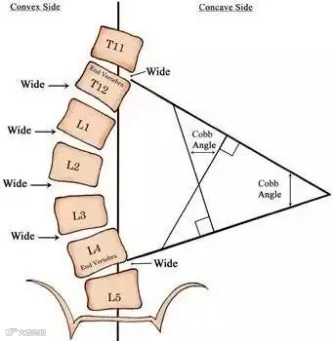 从脊椎骨开始偏移中线的位置开始算,以这一块椎骨(如上图的T12)的上缘画一条平行线;再找到最下面偏离中线的那块椎骨(如上图的L4)的下缘,沿着椎体的下缘画一条平行线,上下两块锥骨的两条平行线延伸出去以后,会有交角,这个角就叫Cobb角,是用于诊断脊柱侧弯非常重要的标志。通过测定Cobb角的度数可以给孩子的脊柱侧弯分度。