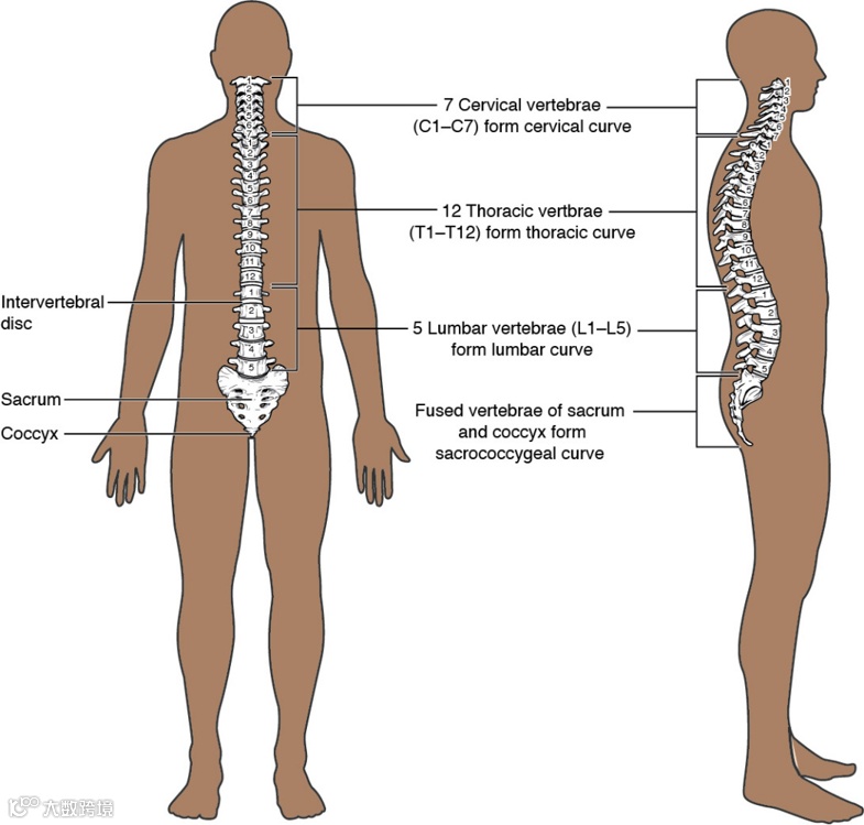 从侧面看,脊柱有4个生理弯曲,分别是颈曲、胸曲、腰曲及骶曲。