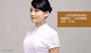 端坐或站立,全身不动,单头部运动,分别做低头、抬头、左转、右转、前伸、后缩;顺、逆时针环绕动作。每次坚持5分钟,动作要轻缓、柔和。