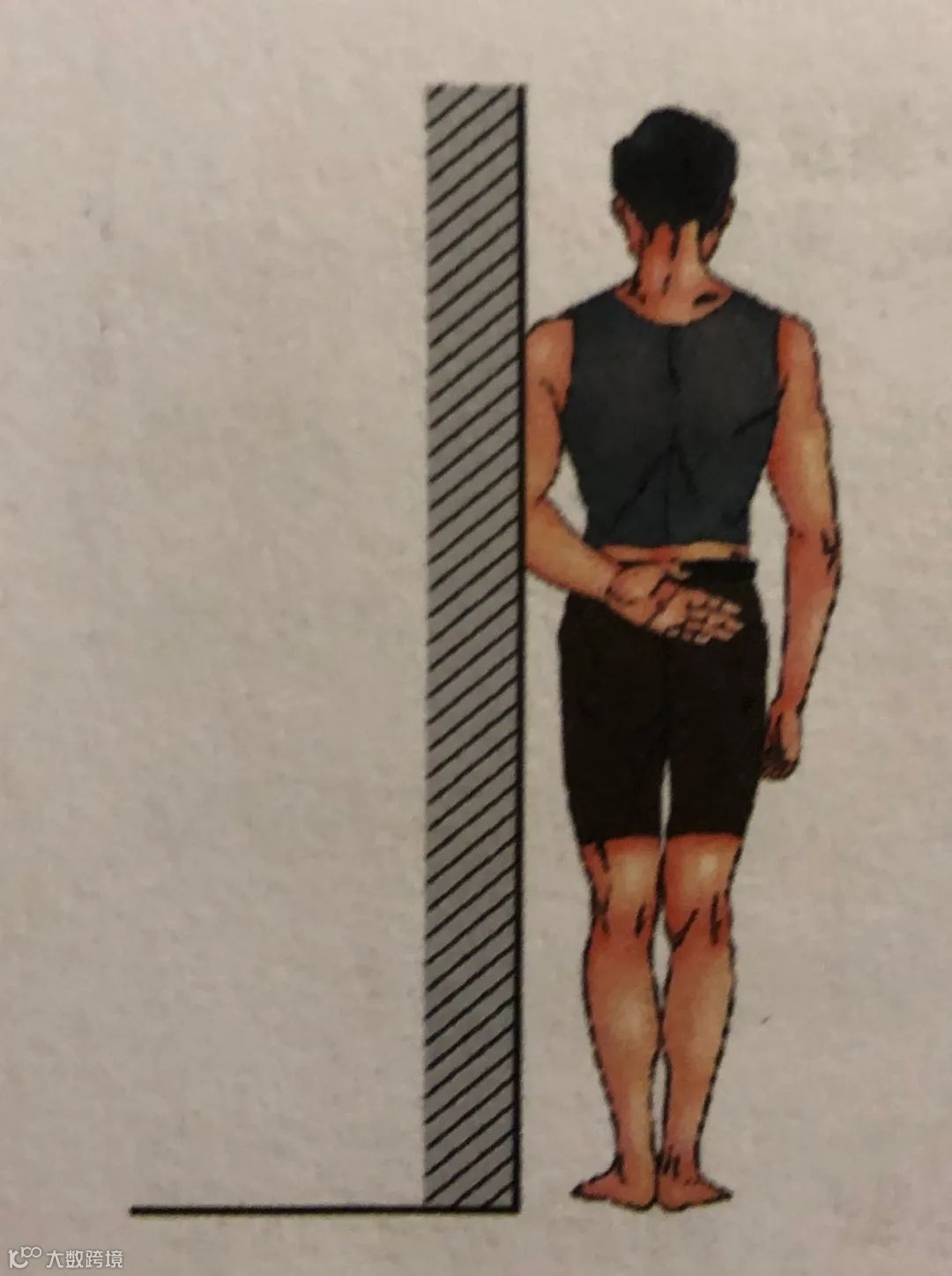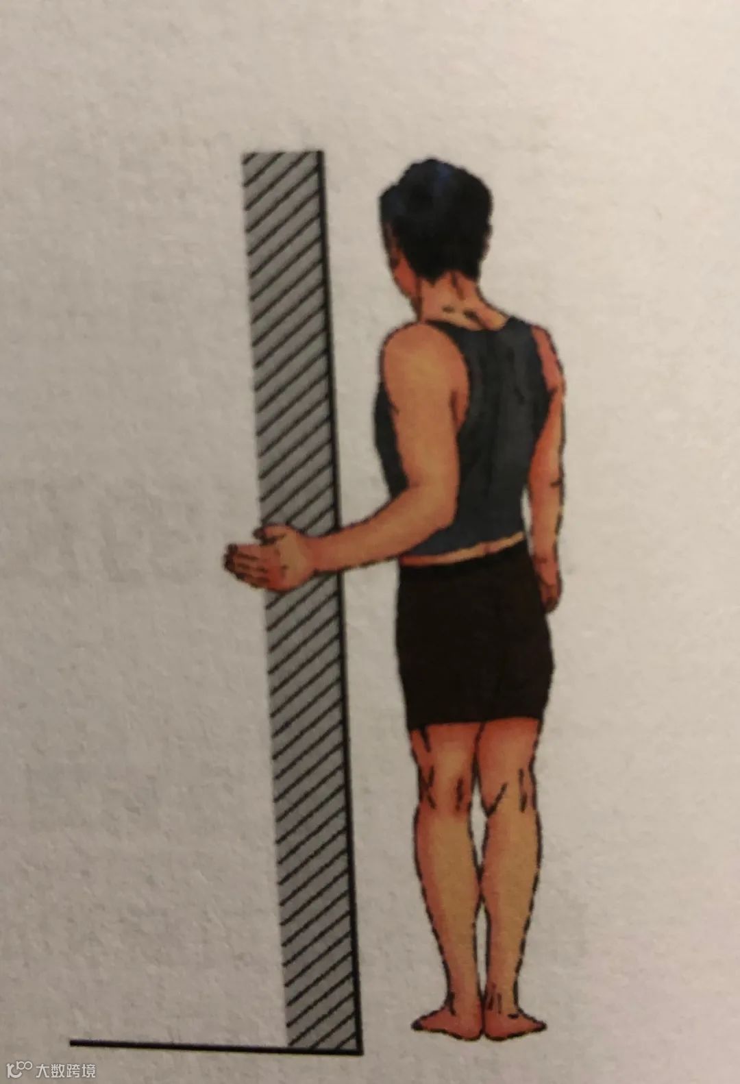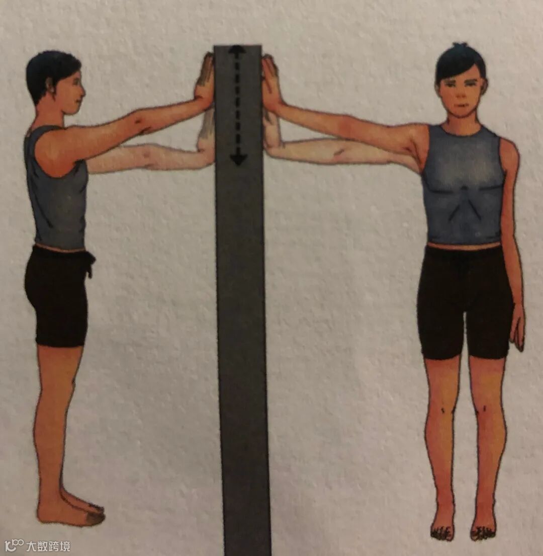 2)外旋:拉伸肩关节囊前部,站立位,屈时约 90°,手掌握住某固定物品保持不动,身体朝远离手掌的方向旋转,当旋转到最大程度或感觉到轻微疼痛时,停止转动,保持 5 秒。