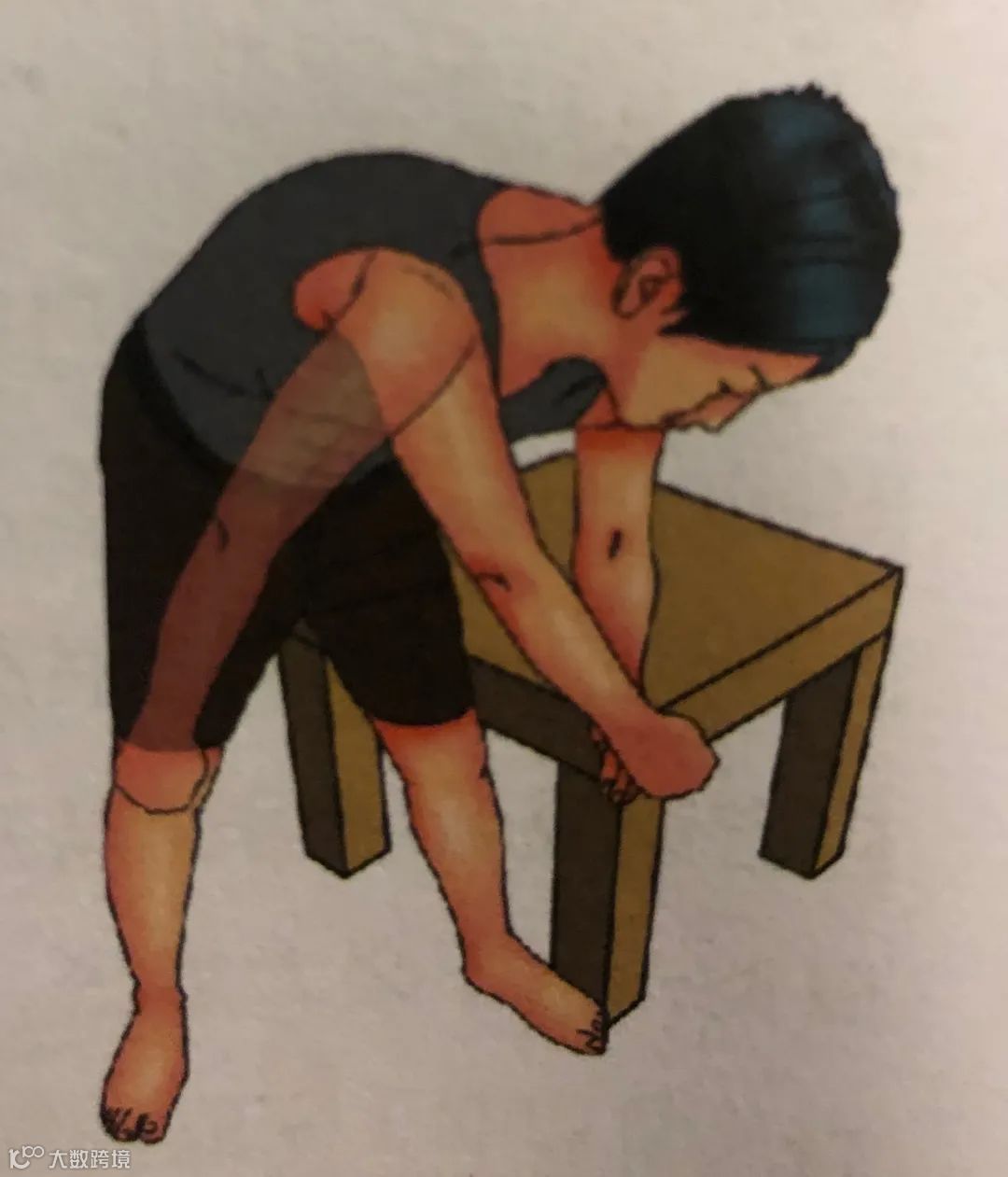 3)内旋:牵伸肩关节囊后部,站立位,手掌置于腰部,肘部支在某固定物品上,身体向肘部旋转,旋转过程中时部位置固定,双脚不动,当旋转到最大程度或感觉到轻微疼痛时,停止转动,保持 5 秒。