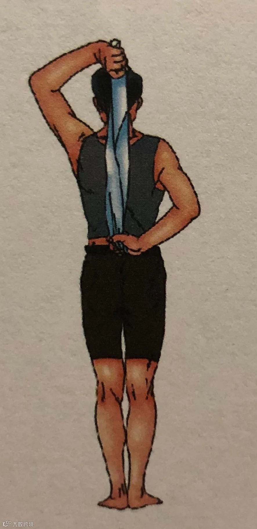 8)毛巾运动:肩肱关节后伸达30°时,健侧上肢在上,患侧在下,双手在背后拉住一条毛巾。