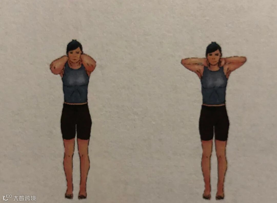 6)水平内收、外展运动:当肩关节上举达90°时,然后双十指交扣,掌心紧贴后脑勺,先向外扩展双臂,使肘部远离头面部,双臂,使上臂贴近头面部。