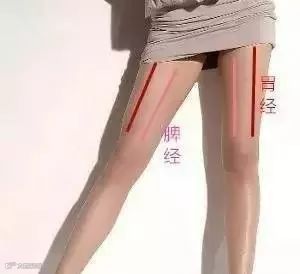 然后,在大腿的正面接着敲,最后再敲一敲小腿中间胫骨的外侧。这些部位都包括了胃经的大穴。
