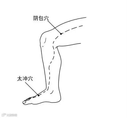 肝经还有一个堵塞点,在膝盖上方大概一掌宽的地方:阴包穴。如果经气堵在这个地方,下面的气就传不过来。这时要先疏通阴包穴。