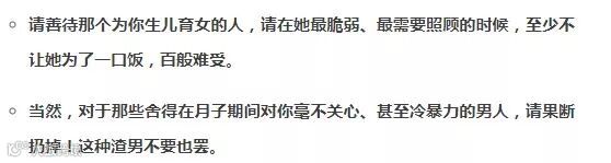 并且警醒那些在月子期间,不能好好照顾妻子。或者默许自己的母亲,不好好照顾妻子的男人。
